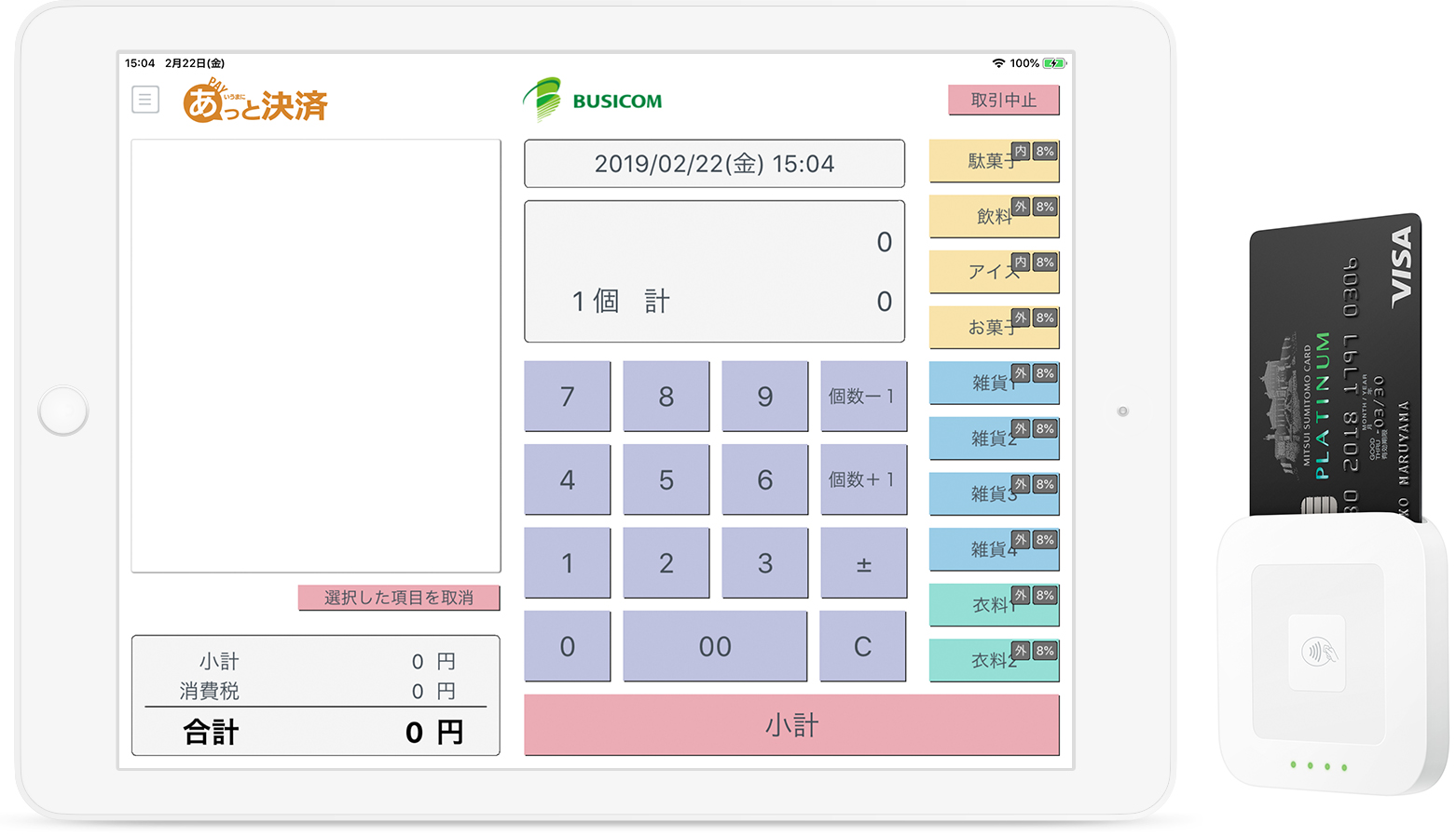 On March 1, 2019, BUSICOM released a free cash register app called “Atto Kessai,” which it runs on iPads. In addition to payment in cash/credit card, the application processes different QR codes of PayPay, d-pay, WeChat Pay, Alipay by connecting to a bar code reader. Features are already incorporated to prepare for changes in the consumption tax rate such as the reduced tax rate scheduled for October 2019.