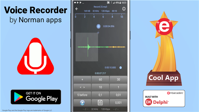 Voice Recorderは、名前のとおりAndroidデバイス向けの高品質ボイスレコーダーで、Delphi + FireMonkeyで作成された多くの素晴らしい機能を備えたアプリです。