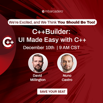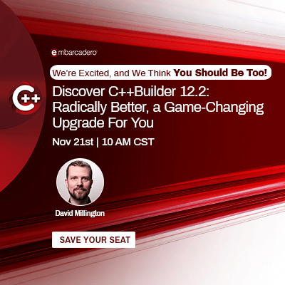 C++Builder 12.2 is a revolutionary leap. No matter what version of C++Builder or compiler you’re using, this is the one you want to use. Tune in to hear about the quality, the linker, the RTL, and the performance; learn how to make your code faster, your libraries more compatible, and your workflow more productive than ever. With enhanced compiler speed, unmatched quality, and seamless integration with Visual Assist, it’s time to leave outdated limitations behind and embrace the future of C++ development.
