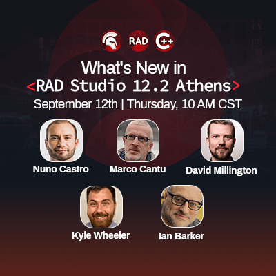 Join Product Managers Marco Cantu, David Millington & Nuno Castro, General Manager Kyle Wheeler, and Developer Advocate Ian Barker to see what’s coming in the RAD Studio 12.2 Athens release for Delphi and C++Builder developers.